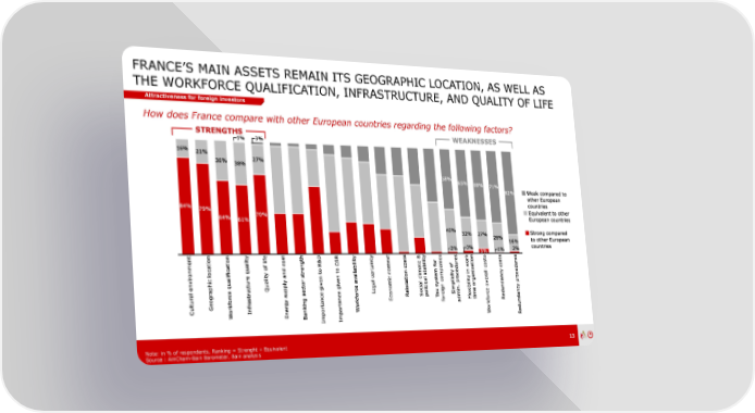FRANCE’S MAIN ASSETS REMAIN ITS GEOGRAPHIC LOCATION, AS WELL AS THE WORKFORCE QUALIFICATION, INFRASTRUCTURE, AND QUALITY OF LIFE Attractiveness for foreign investors How does France compare with other European countries regarding the following factors? STRENGTHS WEAKNESSES Note: in % of respondents, Ranking = Strenght + Equivalent 13 Source : AmCham-Bain Barometer, Bain analysis