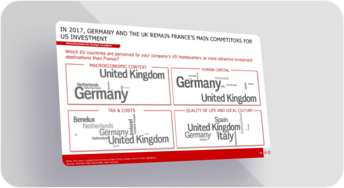IN 2017, GERMANY AND THE UK REMAIN FRANCE’S MAIN COMPETITORS FOR US INVESTMENT Attractiveness for foreign investors Which EU countries are perceived by your company’s US headquarters as more attractive investment destinations than France? MACROECONOMIC CONTEXT HUMAN CAPITAL TAX & COSTS QUALITY OF LIFE AND LOCAL CULTURE Note: Font size is proportional to the number of occurrences a country was mentioned 16 Source: AmCham-Bain Barometer, Bain analysis