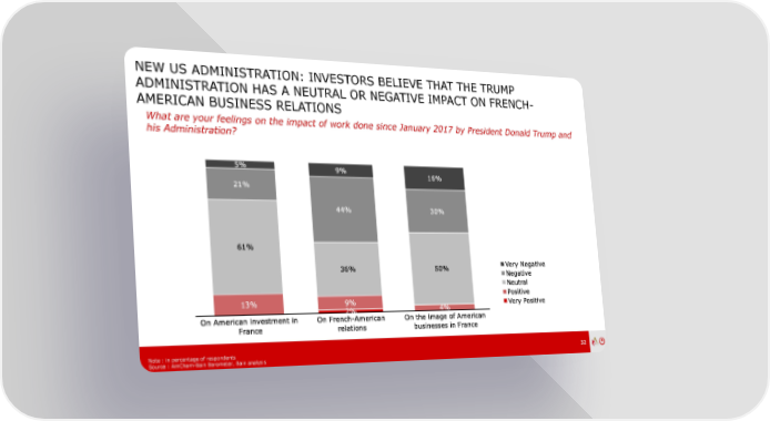 NEW US ADMINISTRATION: INVESTORS BELIEVE THAT THE TRUMP ADMINISTRATION HAS A NEUTRAL OR NEGATIVE IMPACT ON FRENCH- AMERICAN BUSINESS RELATIONS What are your feelings on the impact of work done since January 2017 by President Donald Trump and his Administration? Note : in percentage of respondents 32 Source : AmCham-Bain Barometer, Bain analysis