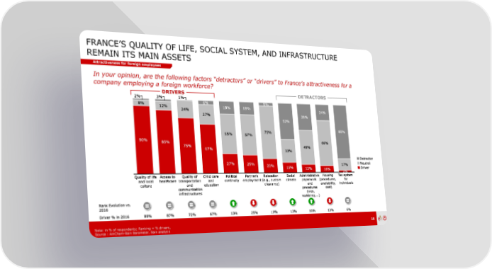 FRANCE’S QUALITY OF LIFE, SOCIAL SYSTEM, AND INFRASTRUCTURE REMAIN ITS MAIN ASSETS Attractiveness for foreign employees In your opinion, are the following factors “detractors” or “drivers” to France’s attractiveness for a company employing a foreign workforce? DRIVERS DETRACTORS Note: in % of respondents; Ranking = % drivers, 18 Source : AmCham-Bain Barometer, Bain analysis