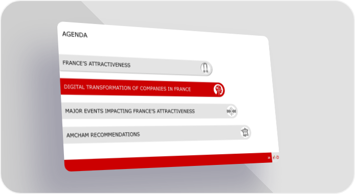 AGENDA FRANCE’S ATTRACTIVENESS DIGITAL TRANSFORMATION OF COMPANIES IN FRANCE MAJOR EVENTS IMPACTING FRANCE’S ATTRACTIVENESS AMCHAM RECOMMENDATIONS 20