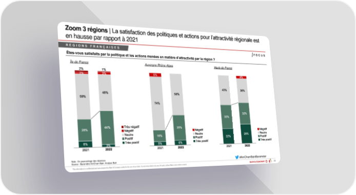 Zoom 3 régions |L s t sf ct o des pol t ques et ct o s pour l’ ttr ct v té rég o le est en hausse par rapport à 2021 R É G I O N S F R A N Ç A I S E S F O C U S Êtes-v us sa sfa s par la p l qu l s ac s s a r ’a rac v par la r g ? Île-de-France Auvergne-Rhône-Alpes Hauts-de-France Note : En pourcentage des réponses #AmChamBainBarometer Source : Baromètre AmCham-Bain, Analyse Bain PAR 35