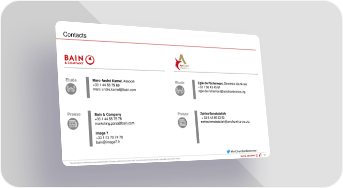 Contacts Etude Marc-André Kamel, Associé Etude Eglé de Richemont, Directrice Générale +33 1 44 55 75 69 +33 1 56 43 45 61 [email protected] [email protected] Presse Bain & Company Presse Zahira Benabdallah +33 1 44 55 75 75 + 33 6 43 95 23 52 [email protected] [email protected] Image 7 +33 1 53 70 74 70 [email protected] #AmChamBainBarometer PAR 38
