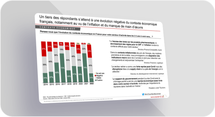U t ers des répo d ts s’ tte d à u e évolut o ég t ve du co texte éco o que fr ç s, ot e t u vu de l’ fl t o et du que de d’œuvre C O N T E X T E É C O N O M I Q U E Pensez-v us qu l’ v lu u c x c qu Fra c p ur v r s c ur ’ac v a s l s - a s à v r s ra… ? “La hausse des taxes sur les produits pharmaceutiques, le durcissement des règles pour le CIR* et l’inflation rendent le contexte difficile pour notre secteur.” Directeur Finance/Comptabilité, Santé “Dans le contexte inflationniste des prix de l'énergie, des matières premières et de la dette, nous envisageons une stagnation des indicateurs macro dans les 2 années à venir pour absorber ces changements et redynamiser l’entreprise.” Directeur Financier, Logistique “Le secteur aérien a connu une forte reprise post-Covid mais des disruptions liées à la supply chain et au prix de l’énergie sont à attendre.” Directeur du développement international, Logistique “Le support du gouvernement pendant la crise Covid avec le chômage partiel a permis une reprise économique assez forte dans notre secteur d’activité, renforcée par l’importance du tourisme dans l’activité en France.” Président, Loisir/ Tourisme Note : E pource t ge de répo ses, * IR : réd t d’ pôt rec erc e #AmChamBainBarometer Source : Baromètre AmCham-Bain, analyse Bain PAR 7