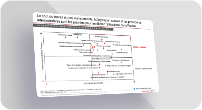 Le coût du travail et des licenciements, la législation sociale et les procédures d str t ves so t les pr or tés pour él orer l’ ttr ct v té de l Fr ce ATTRACTIVITÉ POUR LES INVESTISSEURS AMÉRICAINS + e Atouts à exploiter rancF la de nte ionnemit Pos Pr r s ’a l ra - - Importance des critères + Note : Position de la France = % points forts - % points faibles, Importance des critères = % très important - % pas important #AmChamBainBarometer Source : Baromètre AmCham-Bain, analyse Bain PAR 13