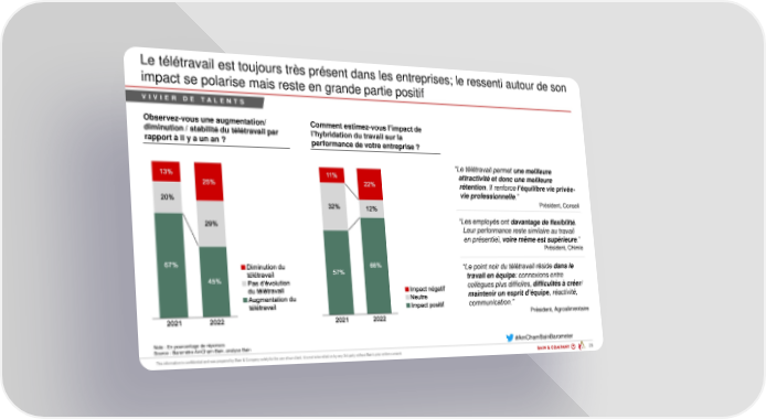 Le télétravail est toujours très présent dans les entreprises; le ressenti autour de son impact se polarise mais reste en grande partie positif V I V I E R D E T A L E N T S Observez-vous une augmentation/ Comment estimez-v us l’ pac diminution / stabilité du télétravail par l’hybr a u rava l sur la rapport à il y a un an ? performance de votre entreprise ? “Le télétravail permet une meilleure attractivité et donc une meilleure rétention. Il renforce l’équilibre vie privée- vie professionnelle.” Président, Conseil “Les employés ont davantage de flexibilité. Leur performance reste similaire au travail en présentiel, voire même est supérieure.” Président, Chimie “Le point noir du télétravail réside dans le travail en équipe: connexions entre collègues plus difficiles, difficultés à créer/ maintenir un esprit d’équipe, réactivité, communication.” Président, Agroalimentaire Note : En pourcentage de réponses #AmChamBainBarometer Source : Baromètre AmCham-Bain, analyse Bain PAR 26