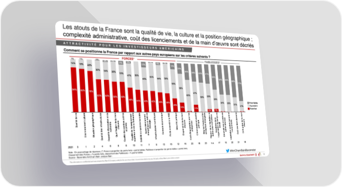Les atouts de la France sont la qualité de vie, la culture et la position géographique ; co plex té d str t ve, coût des l ce c e e ts et de l d’œuvre so t décr és ATTRACTIVITÉ POUR LES INVESTISSEURS AMÉRICAINS Comment se positionne la France par rapport aux autres pays européens sur les critères suivants ? FORCES* FAIBLESSES* Note : En pourcentage de réponses; (*) Force si proportion de points forts > points faibles; Faiblesse si proportion de points faibles > points forts; Classement des Forces = % points forts, classement des Faiblesses = % points faibles #AmChamBainBarometer Source : Baromètre AmCham-Bain, analyse Bain PAR 12