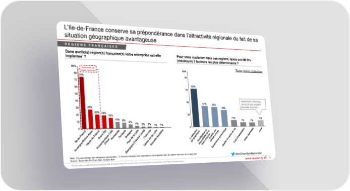 L’Ile-de-Fr ce co serve s prépo dér ce d s l’ ttr ct v té rég o le du f t de s situation géographique avantageuse R É G I O N S F R A N Ç A I S E S Dans quelle(s) région(s) française(s) votre entreprise est-elle Pour vous implanter dans ces régions, quels ont été les implantée*? (maximum) 3 facteurs les plus déterminants ? Toutes régions confondues Zoom dans les pages suivantes Implantation historique, rachat de site existant, proximité d’un hub … Note : E pource t ge des e trepr ses répo d tes ; (*) ucu e e trepr se des répo d ts ’est pl tée d s les rég o s bsentes de ce graphique #AmChamBainBarometer Source : Baromètre AmCham-Bain, Analyse Bain PAR 33