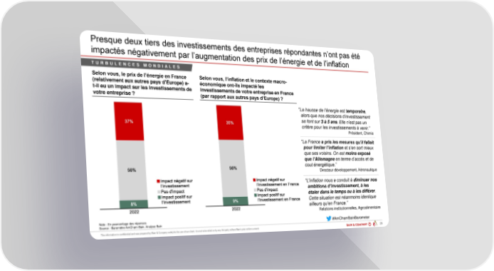 Presque deux t ers des vest sse e ts des e trepr ses répo d tes ’o t p s été p ctés ég t ve e t p r l’ ug e t t o des pr x de l’é erg e et de l’ fl t o T U R B U L E N C E S M O N D I A L E S S l v us, l pr x l’ rg Fra c S l v us, l’ fla l c x acr - (relativement aux autres pays d'Europe) a- économique ont-ils impacté les t-il eu un impact sur les investissements de investissements de votre entreprise en France votre entreprise ? (par rapp r aux au r s pays ’ ur p ) ? “La hausse de l’énergie est temporaire, alors que nos décisions d’investissement se font sur 3 à 5 ans. Elle n’est pas un critère pour les investissements à venir.” Président, Chimie “La France a pris les mesures qu’il fallait pour limiter l’inflation et s’en sort mieux que ses voisins. On est moins exposé que l’Allemagneen terme d’accès et de cout énergétique.” Directeur développement, Aéronautique “L’inflation nous a conduit à diminuer nos ambitions d’investissement, à les étaler dans le temps ou à les différer. Cette situation est néanmoins identique ailleurs qu’en France.” Relations institutionnelles, Agroalimentaire Note : En pourcentage des réponses #AmChamBainBarometer Source : Baromètre AmCham-Bain, Analyse Bain PAR 29