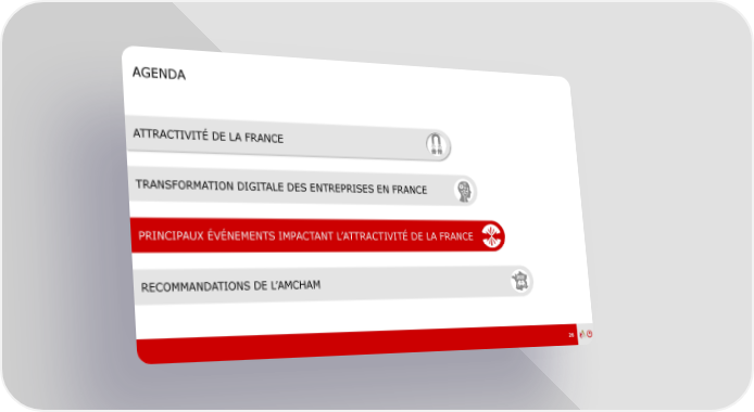 Baromètre Amcham – Bain | Prez | Fr Page 24 Page 26AGENDA ATTRACTIVITÉ DE LA FRANCE TRANSFORMATION DIGITALE DES ENTREPRISES EN FRANCE PRINCIPAUX ÉVÉNEMENTS IMPACTANT L’ATTRACTIVITÉ DE LA FRANCE RECOMMANDATIONS DE L’AMCHAM 26