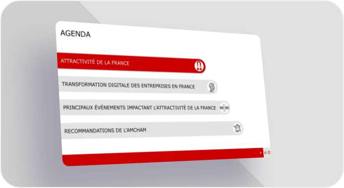 Baromètre Amcham – Bain | Prez | Fr Page 5 Page 7AGENDA ATTRACTIVITÉ DE LA FRANCE TRANSFORMATION DIGITALE DES ENTREPRISES EN FRANCE PRINCIPAUX ÉVÉNEMENTS IMPACTANT L’ATTRACTIVITÉ DE LA FRANCE RECOMMANDATIONS DE L’AMCHAM 6
