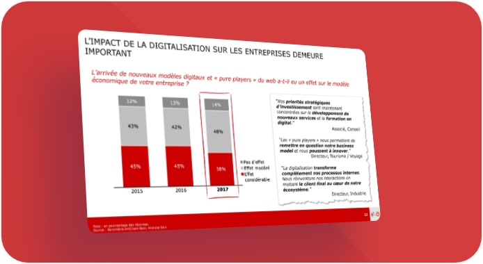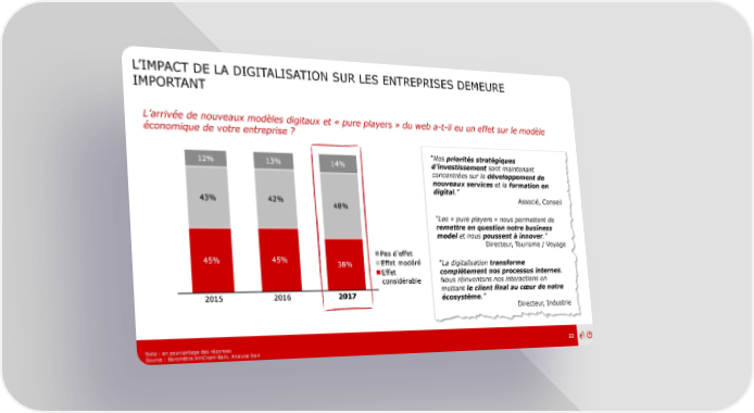 L’IMPACT DE LA DIGITALISATION SUR LES ENTREPRISES DEMEURE IMPORTANT L’arrivée de nouveaux modèles digitaux et « pure players » du web a-t-il eu un effet sur le modèle économique de votre entreprise ? “Nos priorités stratégiques d’investissement sont maintenant concentrées sur le développement de nouveaux services et la formation en digital.” Associé, Conseil “Les « pure players » nous permettent de remettre en question notre business model et nous poussent à innover.” Directeur, Tourisme / Voyage “La digitalisation transforme complètement nos processus internes. Nous réinventons nos interactions en mettant le client final au cœur de notre écosystème.” Directeur, Industrie Note : en pourcentage des réponses 22 Source : Baromètre AmCham-Bain, Analyse Bain