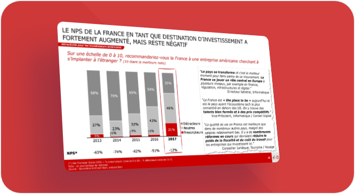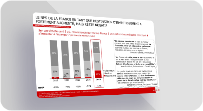 LE NPS DE LA FRANCE EN TANT QUE DESTINATION D’INVESTISSEMENT A FORTEMENT AUGMENTÉ, MAIS RESTE NÉGATIF Attractivité pour les investisseurs américains Sur une échelle de 0 à 10, recommanderiez-vous la France à une entreprise américaine cherchant à s’implanter à l’étranger ? (10 étant la meilleure note) “Le pays se transforme et c’est le meilleur moment pour faire partie de ce mouvement. La France va jouer un rôle central en Europe à plusieurs niveaux, par exemple en finance, régulation, infrastructures et digital.” Directeur Général, Informatique “Le France est « the place to be » aujourd’hui et est le pays ayant l’écosystème tech le plus concentré en dehors des US. On y trouve des talents bien formés et à des prix compétitifs.” Vice-Président, Informatique / Conseil Digital “La qualité de vie en France est meilleure que dans de nombreux autres pays, malgré des salaires relativement bas. Il y a de nombreuses réformes en cours qui devraient réduire le poids de la fiscalité et du coût du travail pour les entreprises qui investissent ici.” Conseiller Juridique, Tourisme / Voyage (*) Net Promoter Score (NPS) = % prescripteurs (note de 9 à 10) - % détracteurs (note de 0 à 6) Note : en pourcentage de réponses 10 Source : Baromètre AmCham-Bain, analyse Bain