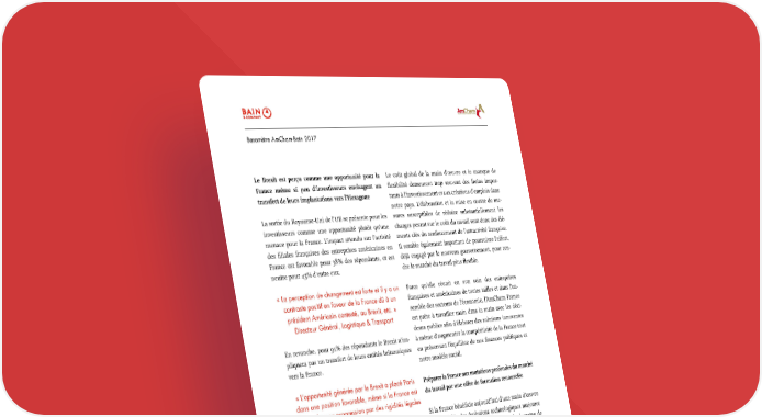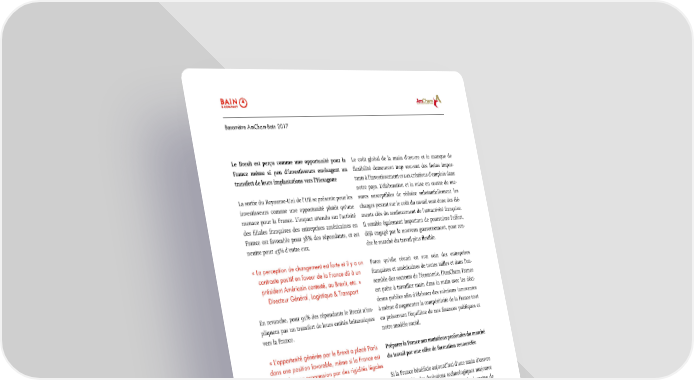 Baromètre AmCham-Bain 2017 Le Brexit est perçu comme une opportunité pour la Le coût global de la main d’œuvre et le manque de France même si peu d’investisseurs envisagent un flexibilité demeurent trop souvent des freins impor- transfert de leurs implantations vers l’Hexagone tants à l’investissement et aux créations d’emplois dans notre pays. L’élaboration et la mise en œuvre de me- La sortie du Royaume-Uni de l’UE se présente pour les sures susceptibles de réduire substantiellement les investisseurs comme une opportunité plutôt qu’une charges pesant sur le coût du travail sont donc des élé- menace pour la France. L’impact attendu sur l’activité ments clés du renforcement de l’attractivité française. des filiales françaises des entreprises américaines en Il semble également important de poursuivre l’effort, France est favorable pour 38% des répondants, et est déjà engagé par le nouveau gouvernement, pour ren- neutre pour 45% d’entre eux. dre le marché du travail plus flexible. « La perception de changement est forte et il y a un Parce qu’elle réunit en son sein des entreprises contraste positif en faveur de la France dû à un françaises et américaines de toutes tailles et dans l’en- président Américain contesté, au Brexit, etc. » semble des secteurs de l’économie, l’AmCham France Directeur Général, Logistique & Transport est prête à travailler main dans la main avec les déci- deurs publics afin d’élaborer des solutions innovantes En revanche, pour 91% des répondants le Brexit n’im- à même d’augmenter la compétitivité de la France tout pliquera pas un transfert de leurs entités britanniques en préservant l’équilibre de nos finances publiques et vers la France. notre modèle social. « L’opportunité générée par le Brexit a placé Paris Préparer la France aux mutations profondes du marché dans une position favorable, même si la France est du travail par une offre de formation renouvelée freinée dans sa progression par des rigidités légales et fiscales » Si la France bénéficie aujourd’hui d’une main d’œuvre Responsable des Opérations, Juridique très qualifiée, les évolutions technologiques majeures qui sont à l’œuvre, par exemple dans le domaine de VIII. Recommandations de l’AmCham l’intelligence artificielle, vont entraîner des mutations profondes du marché du travail. Par ailleurs, malgré Au regard de ces différents constats, l’AmCham France un taux de chômage structurel très élevé au niveau na- souhaite être une force de propositions constructive et tional, de nombreux secteurs font face à une pénurie un partenaire clé des pouvoirs publics. de main d’œuvre et à des difficultés importantes d’em- bauche. Faire du coût et de la flexibilité du travail des atouts pour l’attractivité de la France Afin que notre pays transforme ce défi en une opportu- nité majeure pour les Français, il est urgent que nous Les résultats de notre Baromètre montrent que la nous dotions d’un système de formation prenant France offre une main d’œuvre très qualifiée et com- mieux en compte les besoins futurs des entreprises. A pétitive en termes de coût dans certains secteurs, nota- cet égard, au-delà de la réforme de la formation profes- mment celui des hautes technologies. Il n’en demeure sionnelle, il est essentiel que les sphères privée et pub- pas moins que l’effort doit être étendu à tous les sec- lique travaillent désormais main dans la main afin que teurs de l’économie et à toutes les tailles d’entreprises. la France se dote sur l’ensemble de son territoire d’une 16