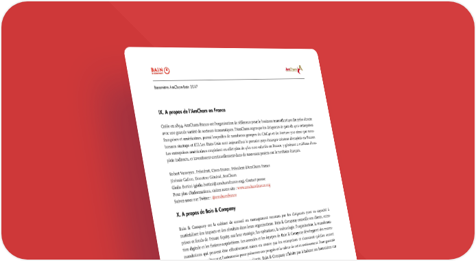 Baromètre AmCham-Bain 2017 IX. A propos de l’AmCham en France Créée en 1894, AmCham France est l’organisation de référence pour le business transatlantique.En prise directe avec une grande variété de secteurs économiques, l’AmCham regroupe les dirigeants de près de 400 entreprises françaises et américaines, parmi lesquelles de nombreux groupes du CAC40 et du Fortune 500 ainsi que nom- breuses startups et ETI.Les Etats-Unis sont aujourd’hui le premier pays étranger créateur d’emplois en France. Les entreprises américaines emploient en effet plus de 460 000 salariés en France, y générant 2 millions d’em- plois indirects, et investissent continuellement dans de nouveaux projets sur le territoire français. Robert Vassoyan, Président, Cisco France, Président d’AmCham France Jérémie Gallon, Directeur Général, AmCham Giulia Buttini (giulia.buttini@amchamfrance.org), Contact presse Pour plus d’informations, visitez notre site : www.amchamfrance.org Suivez-nous sur Twitter : @amchamfrance X. A propos de Bain & Company Bain & Company est le cabinet de conseil en management reconnu par les dirigeants pour sa capacité à matérialiser des impacts et des résultats dans leurs organisations. Bain & Company conseille ses clients, entre- prises et fonds de Private Equity, sur leur stratégie, les opérations, la technologie, l’organisation, la transforma- tion digitale et les fusions-acquisitions. Les associés et les équipes de Bain & Company développent des recom- mandations qui peuvent être effectivement mises en œuvre par les entreprises et s’assurent qu’elles auront ensuite la compétence et l’autonomie pour préserver ces progrès et la valeur de cet investissement. Pour garantir l’alignement des intérêts du cabinet avec ses clients, Bain & Company n’hésite pas à indexer ses honoraires sur la performance constatée de ses interventions. Fondé en 1973, Bain & Company s’appuie sur 55 bureaux dans 36 pays pour accompagner les entreprises de tous les secteurs d’activité et sur tous leurs marchés. Marc-André Kamel, Associé, Bain & Company, Vice-Président de l’AmCham France Caroline Detalle (caroline.detalle@Bain.com), Directrice Marketing, Bain & Company Stéphanie Herrmann (stephanie.herrmann@bain.com), Contact presse Pour plus d’informations, visitez notre site : www.bain.fr Suivez-nous sur Twitter : @BainCompanyFR ou @BainAlerts 18