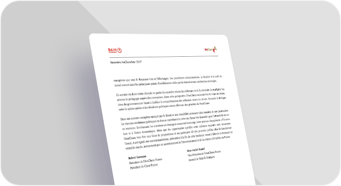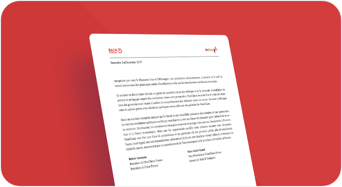 Baromètre AmCham-Bain 2017 européens que sont le Royaume-Uni et l’Allemagne. Les procédures administratives, la fiscalité et le coût du travail restent ainsi les principaux points d’amélioration cités par les investisseurs américains interrogés. Ce constat en demi-teinte découle en partie du caractère récent des réformes et de la nécessité de multiplier les actions de pédagogie auprès des entreprises. Dans cette perspective, l’AmCham souhaite être le relais des initia- tives du gouvernement visant à faciliter la compréhension des réformes mises en œuvre. Soutenir le dialogue entre la sphère privée et les décideurs politiques est en effet une des priorités de l’AmCham. Dans un contexte européen marqué par le Brexit et une instabilité croissante chez nombre de nos partenaires, les récentes évolutions politiques en France contribuent à créer un climat très favorable pour l’attractivité de no- tre territoire. Dorénavant, les investisseurs étrangers associent davantage notre pays au changement, à l’innova- tion et à l’essor économique. Alors que les opportunités qu’offre cette inflexion majeure sont immenses, l’AmCham veut être une force de propositions et un partenaire clé des pouvoirs publics afin de transformer l’essai. A cet égard, nos recommandations, présentées à la fin de cette brochure, visent à faire de ce tournant un véritable succès, notamment par un accroissement de l’investissement et de la création d’emplois en France. Robert Vassoyan Marc-André Kamel Président de l’AmCham France Vice-Président de l’AmCham France Président de Cisco France Associé de Bain & Company 4