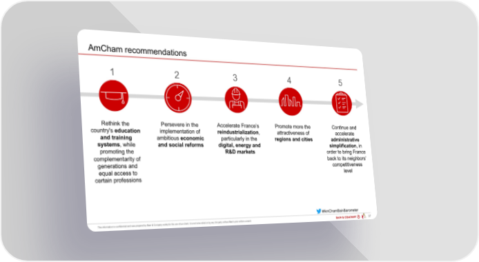 AmCham recommendations 1 2 3 4 5 Rethink the Persevere in the Accelerate France’s Promote more the Continue and country's education implementation of reindustrialization, attractiveness of accelerate and training ambitious economic particularly in the regions and cities administrative systems, while and social reforms digital, energy and simplification, in promoting the R&D markets order to bring France complementarity of back to its neighbors’ generations and competitiveness equal access to level certain professions #AmChamBainBarometer PAR 200203 - AmCham Bain Barometer ... 37