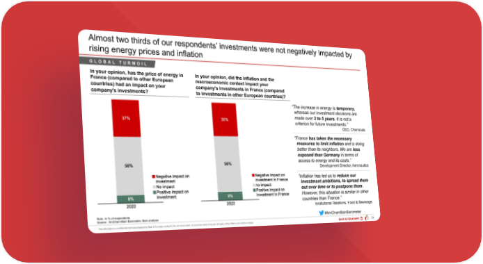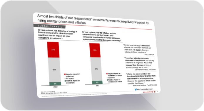 Almost two thirds of our respondents’ investments were not negatively impacted by rising energy prices and inflation GLOBAL TURMOIL In your opinion, has the price of energy in In your opinion, did the inflation and the France (compared to other European macroeconomic context impact your countries) had an impact on your company's investments in France (compared company's investments? to investments in other European countries)? “The increase in energy is temporary, whereas our investment decisions are made over 3 to 5 years. It is not a criterion for future investments.” CEO, Chemicals “France has taken the necessary measures to limit inflation and is doing better than its neighbors. We are less exposed than Germany in terms of access to energy and its costs.” Development Director, Aeronautics “Inflation has led us to reduce our investment ambitions, to spread them out over time or to postpone them. However, this situation is similar in other countries than France.” Institutional Relations, Food & Beverage Note: In % of respondents #AmChamBainBarometer Source : AmCham-Bain Barometer, Bain analysis PAR 200203 - AmCham Bain Barometer ... 29