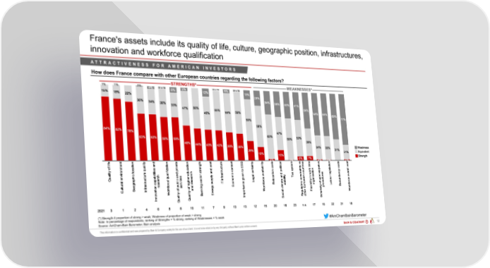 France's assets include its quality of life, culture, geographic position, infrastructures, innovation and workforce qualification ATTRACTIVENESS FOR AMERICAN INVESTORS How does France compare with other European countries regarding the following factors? STRENGTHS* WEAKNESSES* (*) Strength if proportion of strong > weak; Weakness of proportion of weak > strong Note: In percentage of respondents, ranking of Strengths = % strong, ranking of Weaknesses = % weak #AmChamBainBarometer Source: AmCham-Bain Barometer, Bain analysis PAR 200203 - AmCham Bain Barometer ... 12