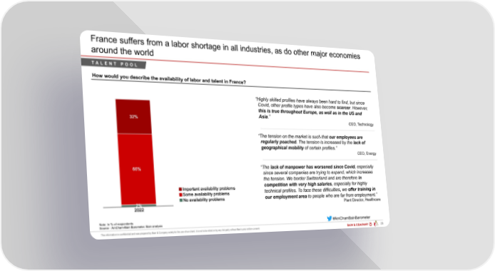 France suffers from a labor shortage in all industries, as do other major economies around the world TALENT POOL How would you describe the availability of labor and talent in France? “Highly skilled profiles have always been hard to find, but since Covid, other profile types have also become scarcer. However, this is true throughout Europe, as well as in the US and Asia.” CEO, Technology “The tension on the market is such that our employees are regularly poached. The tension is increased by the lack of geographical mobility of certain profiles.” CEO, Energy “The lack of manpower has worsened since Covid, especially since several companies are trying to expand, which increases the tension. We border Switzerland and are therefore in competition with very high salaries, especially for highly technical profiles. To face these difficulties, we offer training in our employment area to people who are far from employment.” Plant Director, Healthcare Note: In % of respondents #AmChamBainBarometer Source : AmCham-Bain Barometer, Bain analysis PAR 200203 - AmCham Bain Barometer ... 25