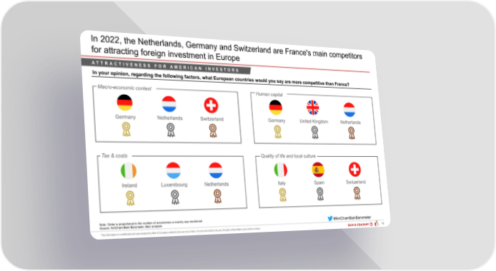In 2022, the Netherlands, Germany and Switzerland are France's main competitors for attracting foreign investment in Europe ATTRACTIVENESS FOR AMERICAN INVESTORS In your opinion, regarding the following factors, what European countries would you say are more competitive than France? Macro-economic context Human capital Germany Netherlands Switzerland Germany United Kingdom Netherlands Tax & costs Quality of life and local culture Ireland Luxembourg Netherlands Italy Spain Switzerland Note: Order is proportional to the number of occurrences a country was mentioned #AmChamBainBarometer Source: AmCham-Bain Barometer, Bain analysis PAR 200203 - AmCham Bain Barometer ... 16