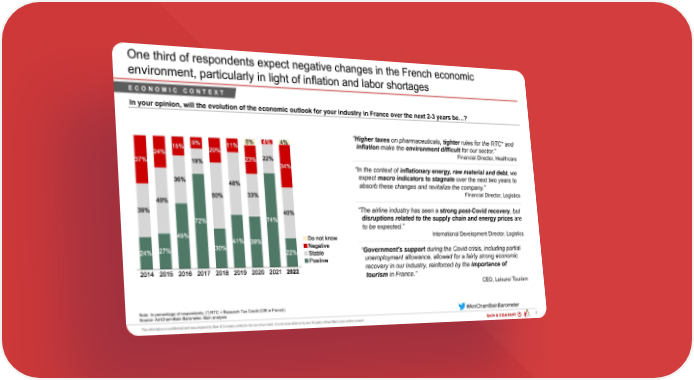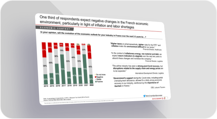 One third of respondents expect negative changes in the French economic environment, particularly in light of inflation and labor shortages ECONOMIC CONTEXT In your opinion, will the evolution of the economic outlook for your industry in France over the next 2-3 years be…? “Higher taxes on pharmaceuticals, tighter rules for the RTC* and inflation make the environment difficult for our sector.” Financial Director, Healthcare “In the context of inflationary energy, raw material and debt, we expect macro indicators to stagnate over the next two years to absorb these changes and revitalize the company.” Financial Director, Logistics “The airline industry has seen a strong post-Covid recovery, but disruptions related to the supply chain and energy prices are to be expected.” International Development Director, Logistics “Government's support during the Covid crisis, including partial unemployment allowance, allowed for a fairly strong economic recovery in our industry, reinforced by the importance of tourism in France.” CEO, Leisure/ Tourism Note: In percentage of respondents; (*) RTC = Research Tax Credit (CIR in French) #AmChamBainBarometer Source: AmCham-Bain Barometer, Bain analysis PAR 200203 - AmCham Bain Barometer ... 7