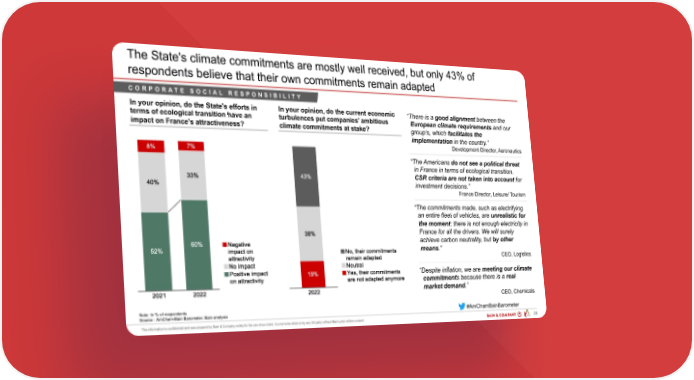 The State's climate commitments are mostly well received, but only 43% of respondents believe that their own commitments remain adapted CORPORATE SOCIAL RESPONSIBILITY In your opinion, do the State's efforts in In your opinion, do the current economic “There is a good alignment between the terms of ecological transition have an turbulences put companies’ ambitious European climate requirements and our impact on France's attractiveness? climate commitments at stake? group’s, which facilitates the implementation in the country.” Development Director, Aeronautics “The Americans do not see a political threat in France in terms of ecological transition. CSR criteria are not taken into account for investment decisions.” France Director, Leisure/ Tourism “The commitments made, such as electrifying an entire fleet of vehicles, are unrealistic for the moment: there is not enough electricity in France for all the drivers. We will surely achieve carbon neutrality, but by other means.” CEO, Logistics “Despite inflation, we are meeting our climate commitments because there is a real market demand.” CEO, Chemicals Note: In % of respondents #AmChamBainBarometer Source : AmCham-Bain Barometer, Bain analysis PAR 200203 - AmCham Bain Barometer ... 28