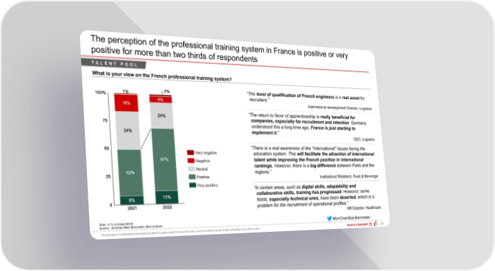The perception of the professional training system in France is positive or very positive for more than two thirds of respondents TALENT POOL What is your view on the French professional training system? “The level of qualification of French engineers is a real asset for recruiters.” International development Director, Logistics “The return to favor of apprenticeship is really beneficial for companies, especially for recruitment and retention. Germany understood this a long time ago, France is just starting to implement it.” CEO, Logistics “There is a real awareness of the "international" issues facing the Very negative education system. This will facilitate the attraction of international Negative talent while improving the French position in international Neutral rankings. However, there is a big difference between Paris and the regions.” Positive Institutional Relations, Food & Beverage Very positive “In certain areas, such as digital skills, adaptability and collaborative skills, training has progressed. However, some fields, especially technical ones, have been deserted, which is a problem for the recruitment of operational profiles.” HR Director, Healthcare Note: In % of respondents #AmChamBainBarometer Source : AmCham-Bain Barometer, Bain analysis PAR 200203 - AmCham Bain Barometer ... 23