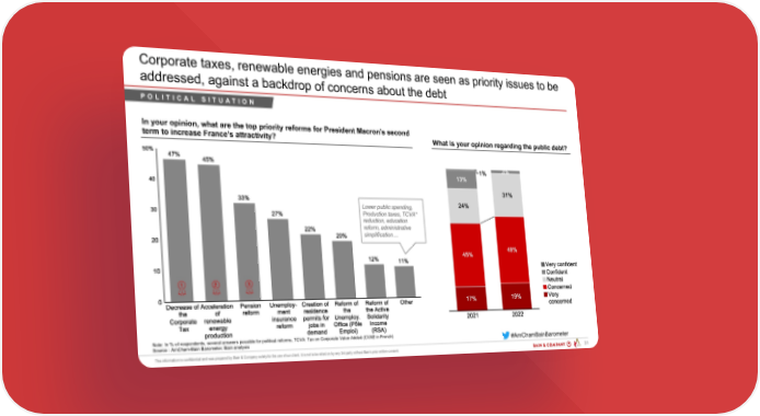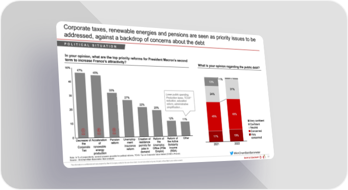 Corporate taxes, renewable energies and pensions are seen as priority issues to be addressed, against a backdrop of concerns about the debt POLITICAL SITUATION In your opinion, what are the top priority reforms for President Macron’s second term to increase France’s attractivity? What is your opinion regarding the public debt? Lower public spending, Production taxes, TCVA* reduction, education reform, administrative simplification… 1 2 3 Note: In % of respondents, several answers possible for political reforms, TCVA: Tax on Corporate Value Added (CVAE in French) #AmChamBainBarometer Source : AmCham-Bain Barometer, Bain analysis PAR 200203 - AmCham Bain Barometer ... 31