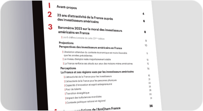 Sommaire I Avant-propos 4 2 23 ans d’attractivité de la France auprès 6 des investisseurs américains 3 Baromètre 2023 sur le moral des investisseurs 8 américains en France | Les 6 chiffres à retenir de cette 23ème édition 8 Projections 10 Perspectives des investisseurs américains en France | L’évolution attendue du contexte économique est moins favorable 11 que les années précédentes | Le niveau d’emploi reste majoritairement stable 12 | La France renforce ses atouts aux yeux des maisons-mères américaines 12 Perceptions 14 La France et ses régions vues par les investisseurs américains | L’attractivité de la France pour les investisseurs 15 | L’attractivité de la France pour les personnes physiques 21 | Capacité d’innovation et esprit entrepreneurial 23 | Pool de talents 25 | Transition énergétique 28 | Impact des turbulences mondiales 30 | Contexte politique national et régional 31 4 Recommandations de l’AmCham France 36 5 Méthodologie et profil des investisseurs américains 40 interrogés 6 À propos de l’AmCham France et de Bain & Company 42 ème 23 édition Baromètre AmCham-Bain 3