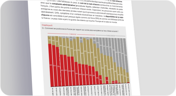 Comment les investisseurs notent-ils la France sur ces critères ? La France se place comme une figure forte sur plusieurs de ces critères, comparativement à ses voisins européens. La qualité de vie, l’environnement culturel et la position géographique sont des forces historiques du pays, rejointes par son excellente capacité d’innovation et de recherche, et l’atout d’infrastructures de qualité, vantées à chaque édition. La haute qualification de la main-d’œuvre française, et notamment le niveau de ses ingénieurs, fait partie des réponses les plus plébiscitées par notre panel également. Côté faiblesses du pays, le coût de la main-d’œuvre (embauches ou licenciements) ainsi que la complexité administrative (procédures légales, extension d’activités, nécessité de parler français…) font partie des points à améliorer chaque année. Cependant, les personnes ayant créé une entreprise au cours des dernières années notent que le processus administratif s’est beaucoup simplifié dernièrement. Enfin, symptôme d’un contexte économique en transition, la disponibilité de la main- d’œuvre est considérée à part presque égale comme une force (19%) et comme une faiblesse (23%) de la France. Le pays reste sujet à la guerre des talents qui touche l’Europe et le reste du monde. Graphique 6 Q : Comment se positionne la France par rapport aux autres pays européens sur les critères suivants ? FORCES* FAIBLESSES* 1% 1% 2% 4% 3% 8% 5% 3% 6% 3% 15% 12% 13% 18% 22% 23% 36% 34% 38% 40% 34% 38% 41% 33% 54% 47% 56% 55% 45% 55% 59% 64% 64% 69% 77% 59% 58% 84% 82% 78% 47% 63% 62% 63% 53% 59% 59% 59% 48% 39% 44% 43% 42% 39% 38% 34% 35% 28% 31% 19% 21% 15% 3% 6% 7% e e s e e e E n s s ) s juridique conomiqu é é t é politique Qualité de vi et de recherchpublics et privés curi temps de travail é Capacité d’innovationQualité des serviceApprovisionnementContexteS Coût d’implantatiopour les entrepriseRégime fiscal pour lesLégislation sociale Environnement culturelSituation géographiqueQualité des infrastructuresQualité de l’enseignementInfrastructures numériquesPoids accordé à la RSentreprises étrangèresautres pays européen(emploi et licenciementCoût des licenciement Qualification de la main-d’œuvresupérieur et de la recherchSolidité du système bancairénergétique et coût de l’énergieDisponibilité de la main-d’œuvreRigueur de la régulation vsCoût global de la main-d’œuvre Climat social et stabilitSouplesse dans l’organisation duSimplicité des procédures admin. 2021 371 246581011 913131215120 6123 n.a. 7 19 22 21 18 Point fort Equivalent Point faible *Force si proportion de points forts > points faibles; Faiblesse si proportion de points faibles > points forts; Classement des Forces = % points forts, classement des Faiblesses = % points faibles ème 23 édition Baromètre AmCham-Bain 17