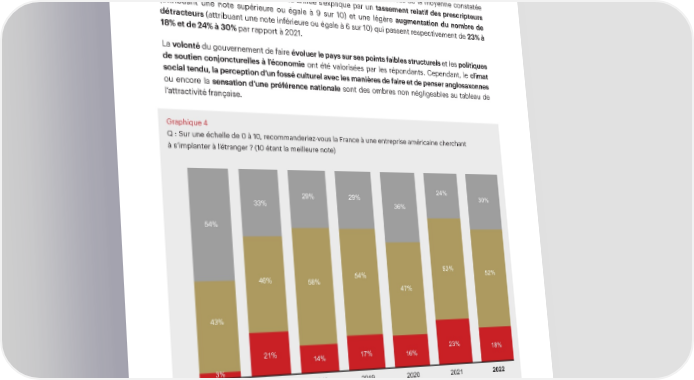 L’attractivité de la France pour les investisseurs Le NPS de la France comme destination d’investissement reste à des niveaux très encourageants Bien qu’en léger reflux, le score NPS* de la France (-12%) reste au-dessus de la moyenne constatée entre 2016 et 2021. La baisse de cette année s’explique par un tassement relatif des prescripteurs (attribuant une note supérieure ou égale à 9 sur 10) et une légère augmentation du nombre de détracteurs (attribuant une note inférieure ou égale à 6 sur 10) qui passent respectivement de 23% à 18% et de 24% à 30% par rapport à 2021. La volonté du gouvernement de faire évoluer le pays sur ses points faibles structurels et les politiques de soutien conjoncturelles à l’économie ont été valorisées par les répondants. Cependant, le climat social tendu, la perception d’un fossé culturel avec les manières de faire et de penser anglosaxonnes ou encore la sensation d’une préférence nationale sont des ombres non négligeables au tableau de l’attractivité française. Graphique 4 Q : Sur une échelle de 0 à 10, recommanderiez-vous la France à une entreprise américaine cherchant à s’implanter à l’étranger ? (10 étant la meilleure note) 29% 29% 24% 30% 33% 36% 54% 54% 53% 52% 46% 58% 47% 43% 21% 14% 17% 16% 23% 18% 3% 2016 2017 2018 2019 2020 2021 2022 NPS* –51% –12% –15% –12% –20% –1% –12% Moyenne = –19% Prescripteurs Neutres Détracteurs SM *Net Promoter Score (NPS®) = % prescripteurs (note de 9 à 10) - % détracteurs (note de 0 à 6) ème 23 édition Baromètre AmCham-Bain 15