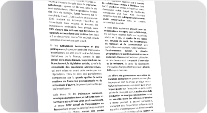 Avant-propos Après deux années de crise sanitaire mondiale, ses pays voisins. Concernant leurs effectifs, et alors que la gestion du Covid-19 semble 56% des répondants estiment que le nombre entrer dans une phase de maturité, l’Europe se de collaborateurs restera à l’équilibre dans trouve à nouveau plongée dans de très fortes les 2-3 prochaines années, indiquant un niveau turbulences : guerre en Ukraine, pénurie de d’embauche stable malgré les inquiétudes semi-conducteurs, inflation galopante, hausse mentionnées plus haut. Cela s’explique des prix de l’énergie, fortes tensions sur le notamment par des politiques de recrutement marché du travail … Les résultats du Baromètre plutôt conservatrices dans un contexte 2023 mettent en évidence l’inconfort et économique incertain. l’incertitude dans lesquels se trouvent les Le pays reste également attractif pour les investisseurs américains. Pour preuve, seuls collaborateurs étrangers, avec un NPS de 17% 22% d’entre eux estiment que l’évolution du (+3 points par rapport à 2021), plus haut niveau contexte économique sera positive dans les 2 atteint en 5 ans. La qualité de vie, l’accès à 3 années à venir, contre 74% en 2021, lors de aux services de santé, les infrastructures la reprise économique post-Covid. de transport et de communication sont Si les turbulences économiques et géo- particulièrement appréciés. Côté investisseurs, politiques expliquent en partie les craintes des l’environnement culturel, la situation investisseurs, ce sont avant tout les faiblesses géographique, la qualité des infrastructures et historiques de la France, comme le coût de la main-d’œuvre sont fortement plébiscités. global de la main-d’œuvre, les procédures de A cela s’ajoute aussi la capacité d’innovation licenciement, la législation sociale, et enfin la et de recherche, la valeur de l’écosystème complexité des procédures administratives, d’innovation français étant reconnue à plus de qui sont mises en avant cette année par nos 80% depuis deux ans. répondants. Elles ne sont que partiellement Les efforts du gouvernement en matière de compensées par la grande qualité de notre transition écologique ne passent pas non plus système de formation professionnelle et de inaperçus et sont de mieux en mieux reçus : notre main-d’œuvre, largement plébiscitée par 60% des investisseurs considèrent qu’ils ont un les investisseurs. impact positif sur l’attractivité du pays, soit 8 Cela étant dit, les indicateurs macroéco- points de plus qu’en 2021. L’accélération de la nomiques semblent tenir, et la France reste un production en énergies renouvelables arrive territoire attractif aux yeux des investisseurs. en seconde place des réformes prioritaires Le score NPS* actuel de l’implantation en à mener pendant le second quinquennat, France d’une entreprise américaine se maintient soulignant ainsi l’importance croissante de la au-dessus du niveau moyen des années transition énergétique pour les investissements. précédentes, avec le plus haut niveau de Le pays apparaît par ailleurs plutôt résilient par prescripteurs depuis 2017 (hormis le pic post- rapport aux autres pays d’Europe confrontés reprise de 2021), témoignant de la confiance aux mêmes enjeux d’inflation et de hausse portée dans la France en comparaison avec des prix de l’énergie. Les deux tiers des SM *Net Promoter® est une marque déposée par Bain & Company, Inc., Fred Reichheld et Satmetrix Systems, Inc. Le Net Promoter Score (NPS®) mesure la propension à recommander un pays, une entreprise ou un produit à travers une unique question : « recommanderiez-vous ce pays, ce produit ou cette entreprise à vos amis ou à vos collègues ? ». Les répondants attribuent en réponse une note de 0 à 10 qui permet de les classer en trois catégories : les prescripteurs (9-10), les neutres (7-8) et les détracteurs (6 et moins). Le NPS® correspond à la différence entre les pourcentages de « prescripteurs » et de « détracteurs ». ème 4 23 édition Baromètre AmCham-Bain