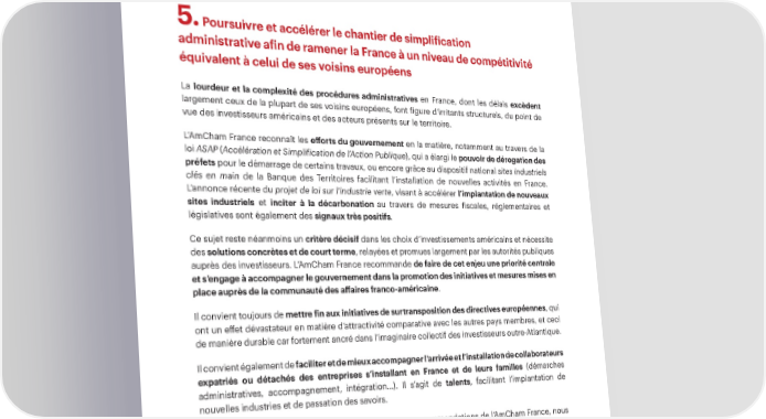 La mise en avant coordonnée de “hubs” spécialisés et complémentaires au sein des territoires et la collaboration entre ces hubs renforceraient l’attractivité des régions et des métropoles tout en répondant mieux aux besoins et aux attentes des investisseurs. Les entreprises américaines plébiscitent le dynamisme des régions ; une plus forte collaboration entre l’Etat et ses territoires serait force d’attraction pérenne. 5. Poursuivre et accélérer le chantier de simplification administrative afin de ramener la France à un niveau de compétitivité équivalent à celui de ses voisins européens La lourdeur et la complexité des procédures administratives en France, dont les délais excèdent largement ceux de la plupart de ses voisins européens, font figure d’irritants structurels, du point de vue des investisseurs américains et des acteurs présents sur le territoire. L’AmCham France reconnaît les efforts du gouvernement en la matière, notamment au travers de la loi ASAP (Accélération et Simplification de l’Action Publique), qui a élargi le pouvoir de dérogation des préfets pour le démarrage de certains travaux, ou encore grâce au dispositif national sites industriels clés en main de la Banque des Territoires facilitant l’installation de nouvelles activités en France. L’annonce récente du projet de loi sur l’industrie verte, visant à accélérer l’implantation de nouveaux sites industriels et inciter à la décarbonation au travers de mesures fiscales, réglementaires et législatives sont également des signaux très positifs. Ce sujet reste néanmoins un critère décisif dans les choix d’investissements américains et nécessite des solutions concrètes et de court terme, relayées et promues largement par les autorités publiques auprès des investisseurs. L’AmCham France recommande de faire de cet enjeu une priorité centrale et s’engage à accompagner le gouvernement dans la promotion des initiatives et mesures mises en place auprès de la communauté des affaires franco-américaine. Il convient toujours de mettre fin aux initiatives de surtransposition des directives européennes, qui ont un effet dévastateur en matière d’attractivité comparative avec les autres pays membres, et ceci de manière durable car fortement ancré dans l’imaginaire collectif des investisseurs outre-Atlantique. Il convient également de faciliter et de mieux accompagner l’arrivée et l’installation de collaborateurs expatriés ou détachés des entreprises s’installant en France et de leurs familles (démarches administratives, accompagnement, intégration…). Il s’agit de talents, facilitant l’implantation de nouvelles industries et de passation des savoirs. Ainsi, en conjuguant ces efforts avec les quatre autres recommandations de l’AmCham France, nous pourrions revoir l’installation de sièges Européens qui avaient déserté le pays au profit du Royaume- Uni (maintenant affaibli par le Brexit), de l’Irlande ou de la Belgique. ème 23 édition Baromètre AmCham-Bain 39