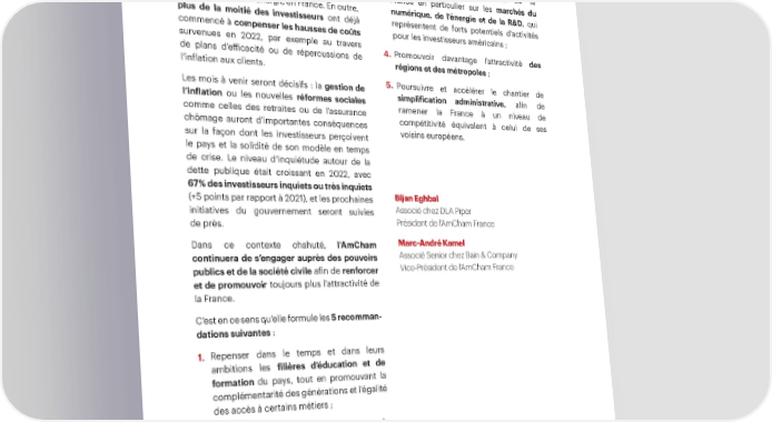 investissements ont été soit positivement 3. Accélérer la réindustrialisation de la impactés, soit non impactés par l’inflation et la France en particulier sur les marchés du hausse des prix de l’énergie en France. En outre, numérique, de l’énergie et de la R&D, qui plus de la moitié des investisseurs ont déjà représentent de forts potentiels d’activités commencé à compenser les hausses de coûts pour les investisseurs américains ; survenues en 2022, par exemple au travers 4. Promouvoir davantage l’attractivité des de plans d’efficacité ou de répercussions de régions et des métropoles ; l’inflation aux clients. Les mois à venir seront décisifs : la gestion de 5. Poursuivre et accélérer le chantier de l’inflation ou les nouvelles réformes sociales simplification administrative, afin de comme celles des retraites ou de l’assurance ramener la France à un niveau de chômage auront d’importantes conséquences compétitivité équivalent à celui de ses sur la façon dont les investisseurs perçoivent voisins européens. le pays et la solidité de son modèle en temps de crise. Le niveau d’inquiétude autour de la dette publique était croissant en 2022, avec 67% des investisseurs inquiets ou très inquiets (+5 points par rapport à 2021), et les prochaines Bijan Eghbal initiatives du gouvernement seront suivies Associé chez DLA Piper de près. Président de l’AmCham France Dans ce contexte chahuté, l’AmCham Marc-André Kamel continuera de s’engager auprès des pouvoirs Associé Senior chez Bain & Company publics et de la société civile afin de renforcer Vice-Président de l’AmCham France et de promouvoir toujours plus l’attractivité de la France. C’est en ce sens qu’elle formule les 5 recomman- dations suivantes : 1. Repenser dans le temps et dans leurs ambitions les filières d’éducation et de formation du pays, tout en promouvant la complémentarité des générations et l’égalité des accès à certains métiers ; 2. Persévérer dans la mise en œuvre de réformes économiques et sociales ambitieuses ; ème 23 édition Baromètre AmCham-Bain 5