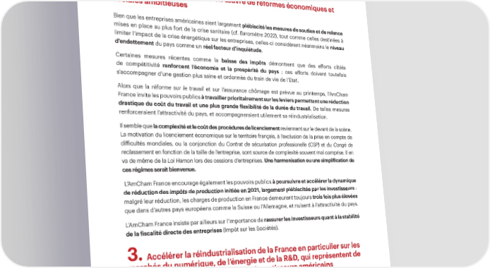 L’AmCham France recommande également d’investir dans un environnement d’accueil plus attractif pour les talents étrangers, en renforçant notamment significativement les offres éducatives et académiques (par le développement de plus d’écoles internationales bilingues, entre autres) et la coopération entre universités et écoles d’enseignement supérieur françaises et américaines. 2. Persévérer dans la mise en œuvre de réformes économiques et sociales ambitieuses Bien que les entreprises américaines aient largement plébiscité les mesures de soutien et de relance mises en place au plus fort de la crise sanitaire (cf. Baromètre 2022), tout comme celles destinées à limiter l’impact de la crise énergétique sur les entreprises, celles-ci considèrent néanmoins le niveau d’endettement du pays comme un réel facteur d’inquiétude. Certaines mesures récentes comme la baisse des impôts démontrent que des efforts ciblés de compétitivité renforcent l’économie et la prospérité du pays ; ces efforts doivent toutefois s’accompagner d’une gestion plus saine et ordonnée du train de vie de l’Etat. Alors que la réforme sur le travail et sur l’assurance chômage est prévue au printemps, l’AmCham France invite les pouvoirs publics à travailler prioritairement sur les leviers permettant une réduction drastique du coût du travail et une plus grande flexibilité de la durée du travail. De telles mesures renforceraient l’attractivité du pays, et accompagneraient utilement sa réindustrialisation. Il semble que la complexité et le coût des procédures de licenciement reviennent sur le devant de la scène. La motivation du licenciement économique sur le territoire français, à l’exclusion de la prise en compte de difficultés mondiales, ou la conjonction du Contrat de sécurisation professionelle (CSP) et du Congé de reclassement en fonction de la taille de l’entreprise, sont source de complexité souvent mal comprise. Il en va de même de la Loi Hamon lors des cessions d’entreprises. Une harmonisation ou une simplification de ces régimes serait bienvenue. L’AmCham France encourage également les pouvoirs publics à poursuivre et accélérer la dynamique de réduction des impôts de production initiée en 2021, largement plébiscitée par les investisseurs : malgré leur réduction, les charges de production en France demeurent toujours trois fois plus élevées que dans d’autres pays européens comme la Suisse ou l’Allemagne, et nuisent à l’attractivité du pays. L’AmCham France insiste par ailleurs sur l’importance de rassurer les investisseurs quant à la stabilité de la fiscalité directe des entreprises (Impôt sur les Sociétés). 3. Accélérer la réindustrialisation de la France en particulier sur les marchés du numérique, de l’énergie et de la R&D, qui représentent de forts potentiels d’activités pour les investisseurs américains L’écosystème d’innovation français est plébiscité par les investisseurs américains. Il faut capitaliser sur celui-ci ! En 2022, le gouvernement a fait de la réindustrialisation de la France une de ses priorités. L’AmCham France se félicite du lancement de mesures phares comme le plan France Relance, le projet de loi Industrie Verte ou encore le plan d’investissement pour soutenir une stratégie nationale d’Intelligence Artificielle, lesquelles vont activement contribuer à redynamiser l’industrie française et les filières d’avenir. ème 23 édition Baromètre AmCham-Bain 37