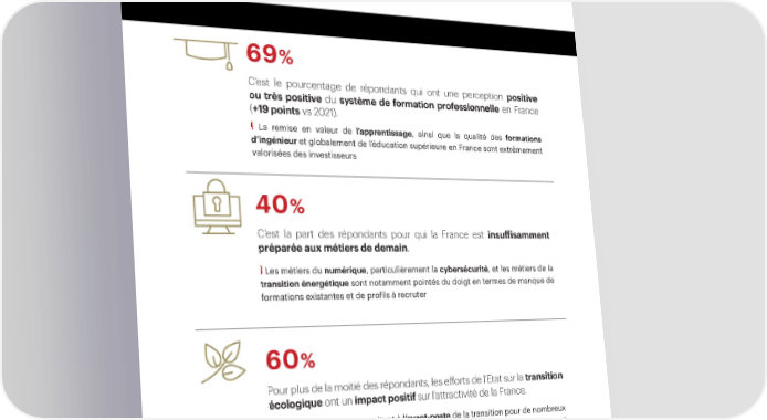 Baromètre 2023 sur le moral des investisseurs américains en France 69% C’est le pourcentage de répondants qui ont une perception positive ou très positive du système de formation professionnelle en France (+19 points vs 2021). I La remise en valeur de l’apprentissage, ainsi que la qualité des formations d’ingénieur et globalement de l’éducation supérieure en France sont extrêmement valorisées des investisseurs 40% C’est la part des répondants pour qui la France est insuffisamment préparée aux métiers de demain. I Les métiers du numérique, particulièrement la cybersécurité, et les métiers de la transition énergétique sont notamment pointés du doigt en termes de manque de formations existantes et de profils à recruter 60% Pour plus de la moitié des répondants, les efforts de l’Etat sur la transition écologique ont un impact positif sur l’attractivité de la France. I La France est vue comme étant à l’avant-poste de la transition pour de nombreux investisseurs en comparaison des autres pays du monde ; certains mentionnent même qu’elle pourrait faire mieux et accroître sa compétitivité si elle devenait le modèle à suivre par toute l’Europe en matière de réglementation ème 23 édition Baromètre AmCham-Bain 9