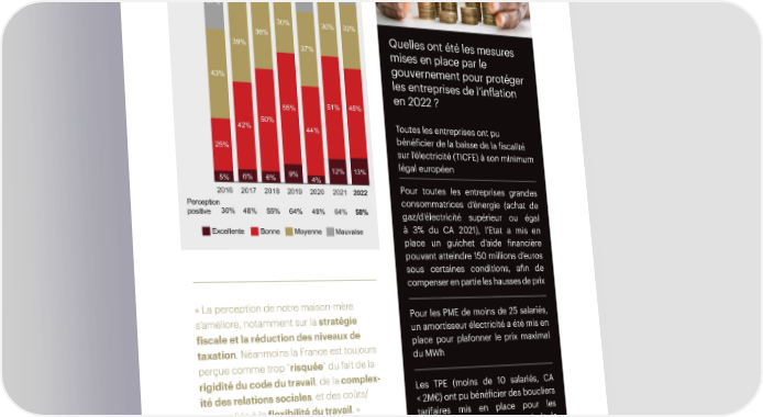 Graphique 3 Q : Selon vous, quelle est la perception de la France par votre maison-mère par rapport à d’autres destinations d’investissement ? 13% 9% 6% 7% 9% 15% 27% 30% 30% 32% 36% Quelles ont été les mesures 39% 37% mises en place par le gouvernement pour protéger 43% les entreprises de l’inflation en 2022 ? 55% 51% 45% 42% 50% Toutes les entreprises ont pu 44% bénéficier de la baisse de la fiscalité 25% sur l’électricité (TICFE) à son minimum 12% 13% légal européen 5% 6% 6% 9% 4% 2016 2017 2018 2019 2020 2021 2022 Pour toutes les entreprises grandes Perception consommatrices d’énergie (achat de positive 30% 48% 55% 64% 48% 64% 58% gaz/d’électricité supérieur ou égal Excellente Bonne Moyenne Mauvaise à 3% du CA 2021), l’Etat a mis en place un guichet d’aide financière pouvant atteindre 150 millions d’euros sous certaines conditions, afin de compenser en partie les hausses de prix « La perception de notre maison-mère Pour les PME de moins de 25 salariés, s’améliore, notamment sur la stratégie un amortisseur électricité a été mis en fiscale et la réduction des niveaux de place pour plafonner le prix maximal taxation. Néanmoins la France est toujours du MWh perçue comme trop “risquée” du fait de la rigidité du code du travail, de la complex- Les TPE (moins de 10 salariés, CA ité des relations sociales, et des coûts/ < 2M€) ont pu bénéficier des boucliers risques liés à la flexibilité du travail. » tarifaires mis en place pour les —Président, Industrie pharmaceutique particuliers, impliquant le gel de la hausse des tarifs de vente du gaz et un plafonnement de l’augmentation du tarif d’électricité ème 23 édition Baromètre AmCham-Bain 13